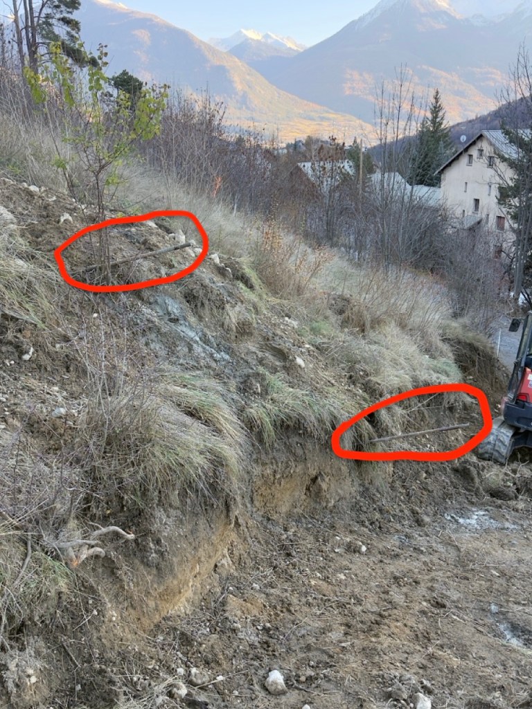 Réalisation d’un micropieux d’essais à 5m et de deux clous d’essais à 5m chacun en Roto-Percussion (R32 diamètre90) sur la commune de Briancon dans les hautes alpes (05) dans le cadre de la réalisation d’une étude géotechnique (G3) pour optimisation des micropieux et de la paroi clouée avant chiffrage définitif.