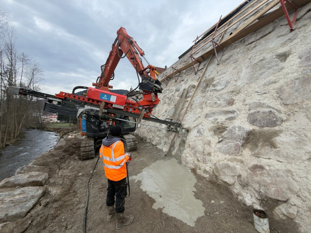 Aide à la Réalisation d’ancrage en Roto-Percussion (R38 diamètres 90) et de drains sub-horizontaux avec le système Roto-Dis(tubage a l’avancement en Soto-percussion) dans un mur en pierre sur la commune de Bussang dans les Vosges (88)